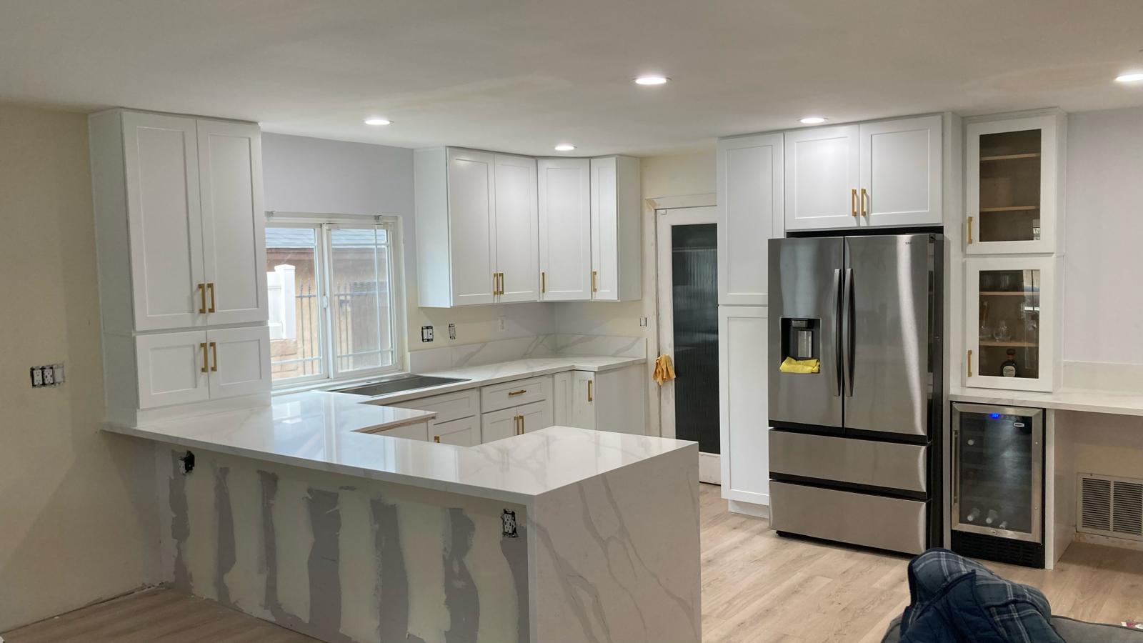 This kitchen remodel blends White Shaker Cabinets with Carrera White Quartz countertops and gold handles, creating a clean, luxurious, and contempo