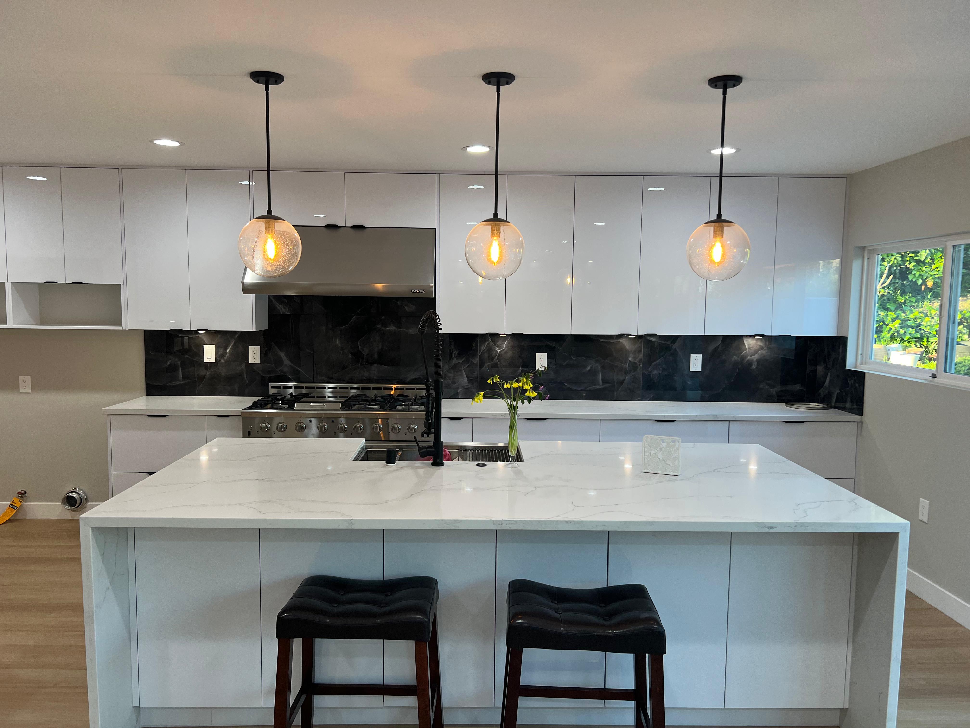 A sleek renovation featuring Modern European flat-panel cabinets paired with premium quartz countertops for a streamlined, contemporary look